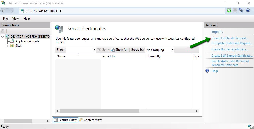 To generate a new certificate signing request using IIS 10 control panel, follow the steps below:
